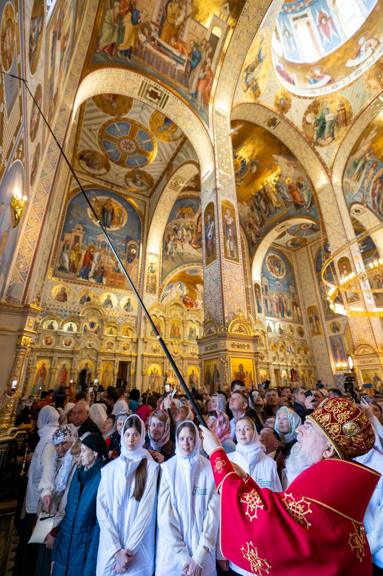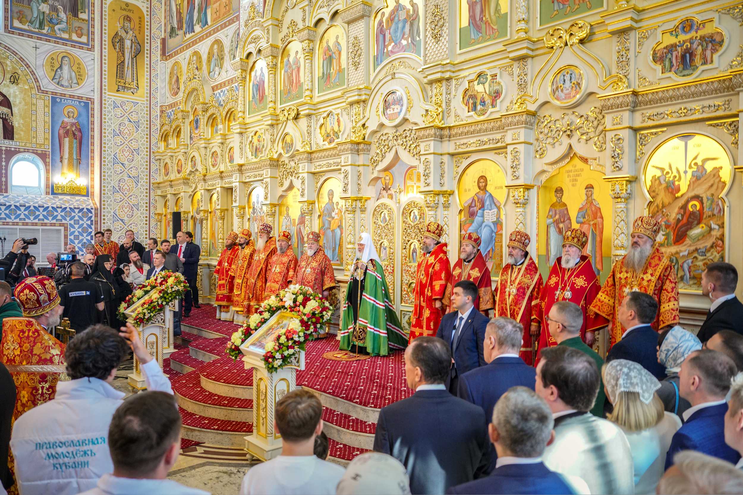 В дар новоосвященному храму Святейший Владыка передал Тихвинскую икону Божией Матери, для храмов Кубанской митрополии — Страстные Евангелия. Митрополиту Василию Святейший Патриарх Кирилл вручил памятные крест и панагию.