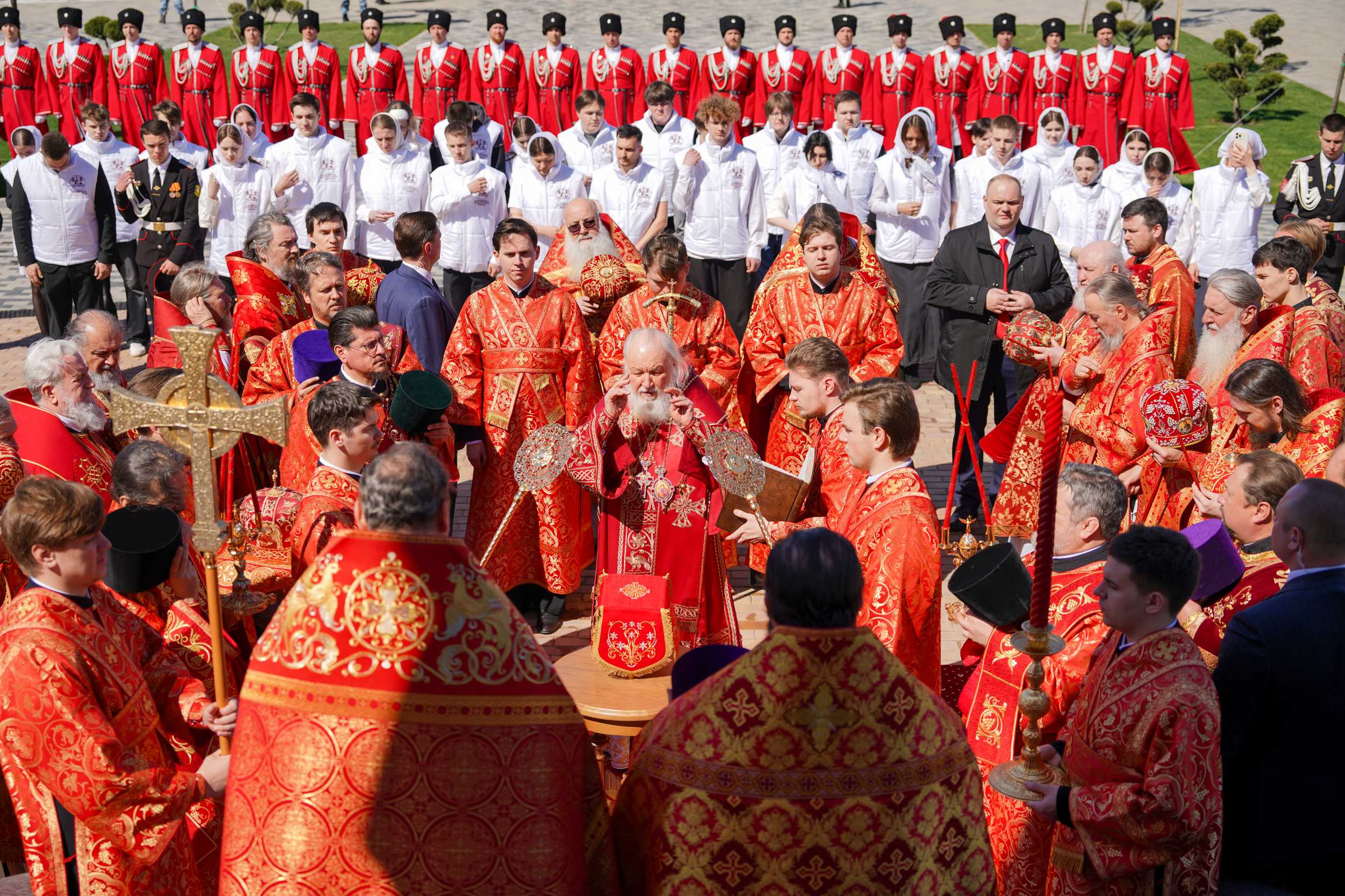 За Литургией Его Святейшеству сослужили: митрополит Воскресенский Григорий, управляющий делами Московской Патриархии; митрополит Ставропольский и Невинномысский Кирилл, председатель Синодального отдела по взаимодействию с Вооруженными силами и правоохранительными органами, председатель Синодального комитета по взаимодействию с казачеством; митрополит Симферопольский и Крымский Тихон, председатель Патриаршего совета по культуре; митрополит Екатеринодарский и Кубанский Василий; епископ Сочинский и Туапсинский Герман; епископ Тихорецкий и Кореновский Стефан; епископ Новороссийский и Геленджикский Сергий; епископ Раменский Алексий, личный секретарь Святейшего Патриарха Кирилла; епископ Армавирский и Лабинский Савва; епископ Ейский и Тимашевский Серафим; духовенство Кубанской митрополии.